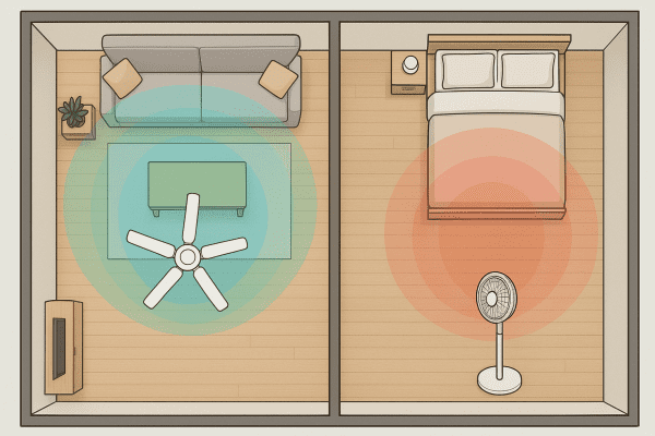 Choosing the right fan for your space depends on room size, ceiling height, and placement. A ceiling fan works best in living rooms with high ceilings. Pedestal and oscillating fans suit bedrooms, garages, or dorms where flexible positioning matters.